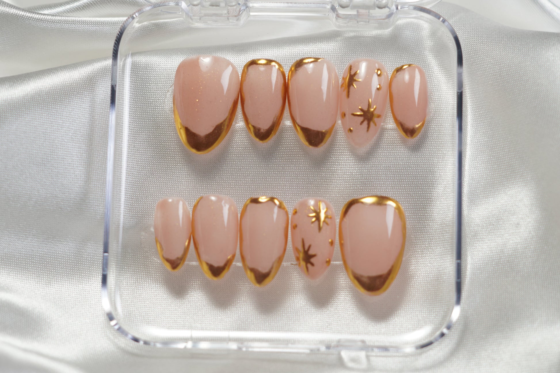 Soft, elegant, and effortlessly luxe. This set features a sheer blush nude base paired with gleaming gold chrome French tips for a timeless yet elevated look. Delicate gold star accents and subtle embellishments add a celestial touch, making this set perfect for special occasions or everyday glam with a refined twist.
